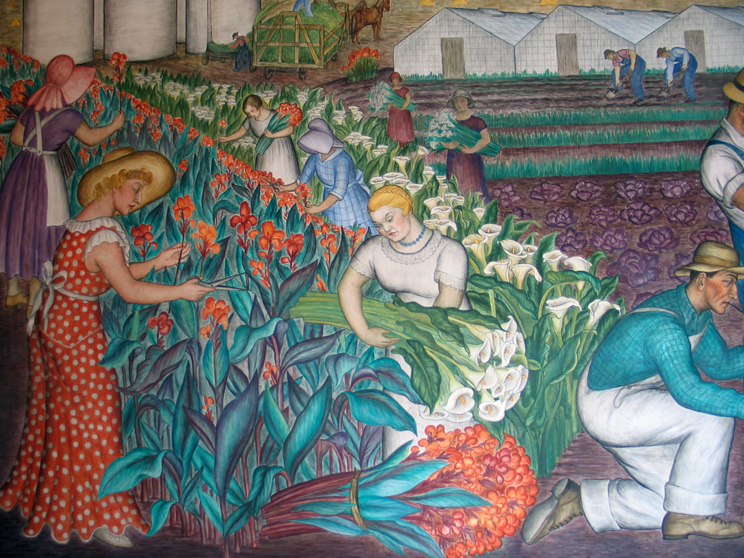Selected from an architectural competition, the tower was designed by Arthur Brown Jr, and Henry Howard. Constructed of unpainted concrete, inside there are 3,691 square feet of murals tell the story of the state of California during those Depression years. Mostly done in fresco, they were painted in a six month period in 1934 by a group of artists employed by the Public Works of Art Project, a New Deal federal employment programme for artists. They are quite remarkable but soon caused controversy. With a bitter longshoremen’s strike underway and the port closed, some members of the San Francisco Art Commission objected to what was described as ‘Communist symbols’ in some of the frescoes. The tower was padlocked and the windows whitewashed. The Chronicle used the headline: ‘Is This Red Propaganda? Murals on Coit Shaft Hint Plot for Red Cause.’ (Some of the artists were fans of Diego Rivera, who had visited the Bay Area a number of times, and whose mural the previous years the Rockefeller Centre in New York had been plastered over before completion when the artist refused to remove an image of Lenin.) The Artists’ and Writers’ Union picketed to protect the Coit murals from being destroyed. While some of the political symbols were allowed to remain - Bernard Zakheim's library scene showing a man pulling a copy of Karl Marx's Das Capital off a bookshelf can still be seen - the hammer and sickle included in Clifford Wight's work was chipped off the wall and an image of the radical newspaper ‘Western Worker’ in John Langley Howard’s mural painted over.
